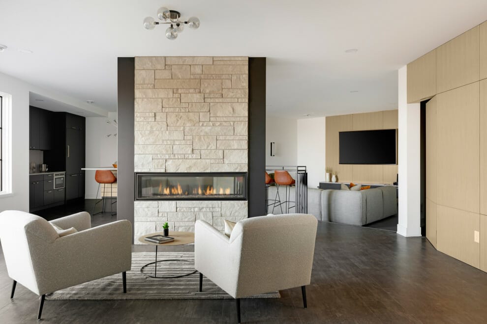 Here, the homeowner angled soft white upholstered armchairs towards the partition wall. The layout encourages cozy conversation and guides the eye to the built-in fireplace.