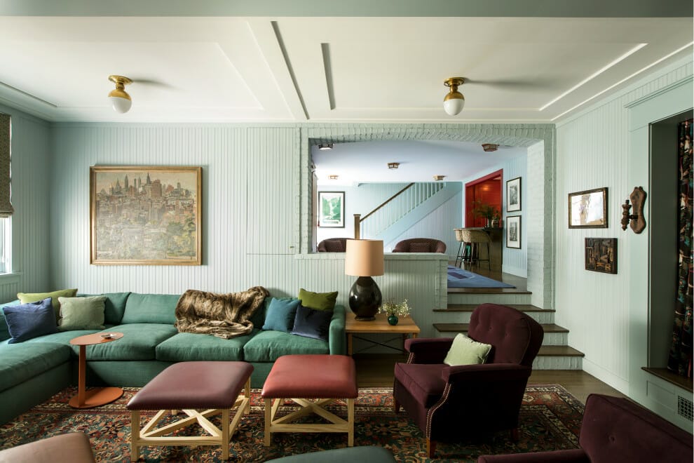 If you need half wall room divider ideas, this interior is worth learning. Pops of pastel hues and laid-back materials make the space a family room.