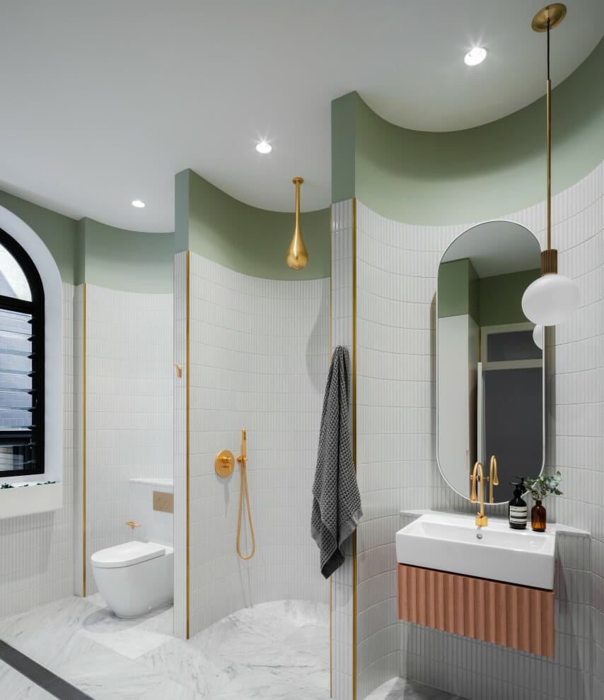 Due to white elongated tiles, the separation walls make the ceiling feel higher. Also, their gold accents deliver a feeling of glamor. Furthermore, the arch, oval mirror, and pastel shades provide an extra punch of personality.