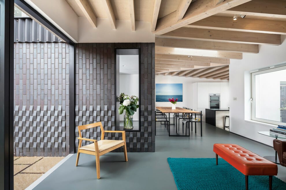 I love this contemporary, open-layout home. The separation wall boasts metal frames and wooden cubes for visual balance.