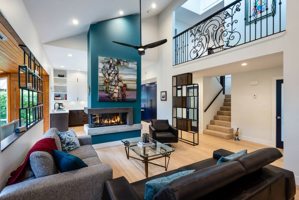 The muted blue fireplace emphasizes the high ceiling. Moreover, it separates the contemporary kitchen from the transitional seating area.