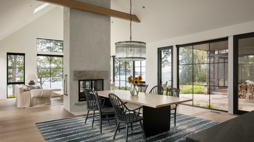 The soaring concrete fireplace doubles as a partition wall. It draws attention to the modern rustic lakeside dining area. Furthermore, sunflowers and wood surfaces ooze warmth.