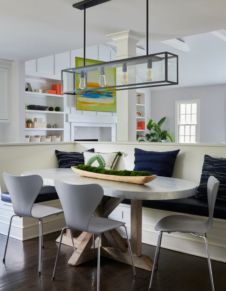 This massive space becomes multifunctional because of a dining nook. Furthermore, the casual eating area has a built-in banquet, an oval table, and mismatched throw pillows.