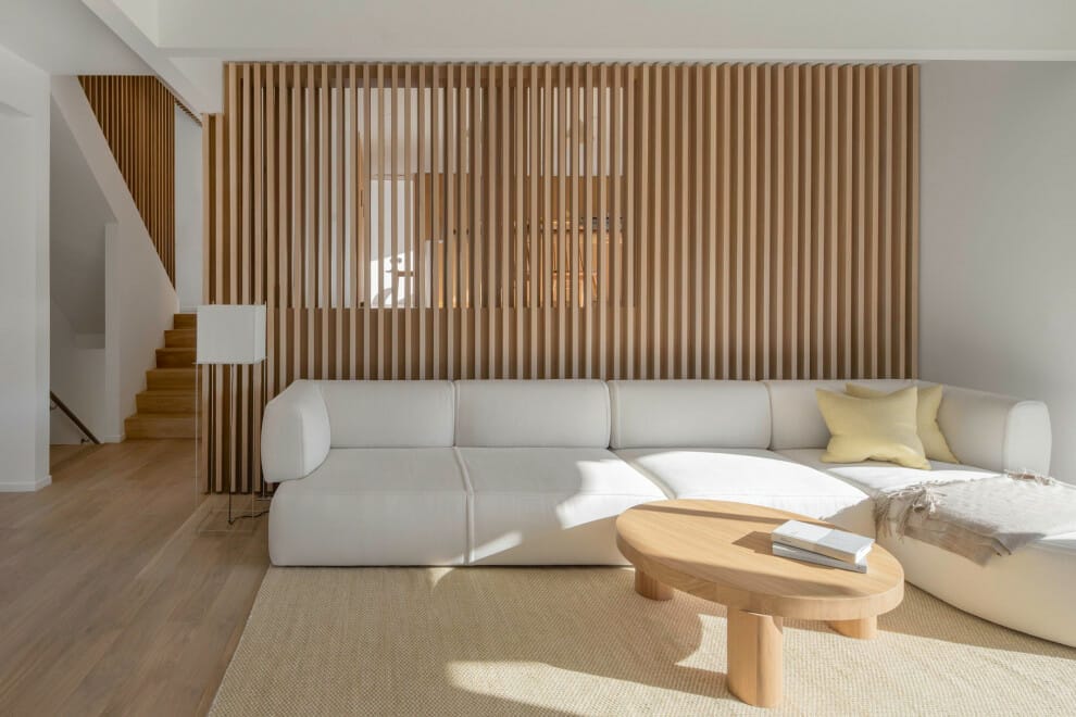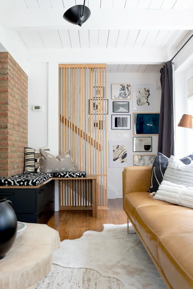 Speaking of dividing wall ideas, consider wooden slats. They separate the seating area from the stairwell while infusing a modern rustic charm.