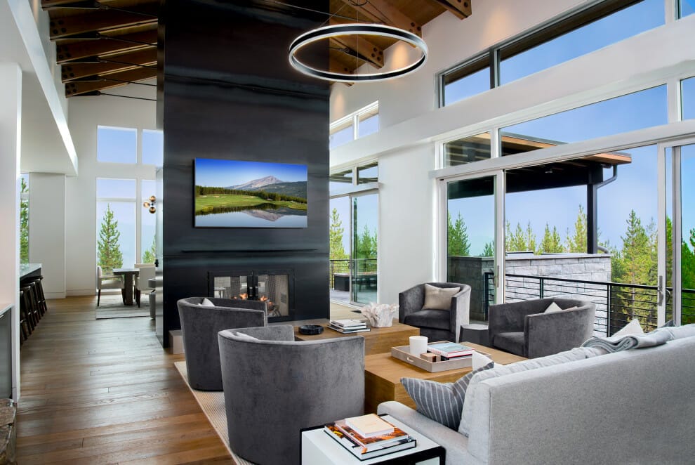 This modern rustic home is admirable. The massive yet sleek metal fireplace acts as a separation wall. It distinguishes the casual dining nook from the formal seating area.