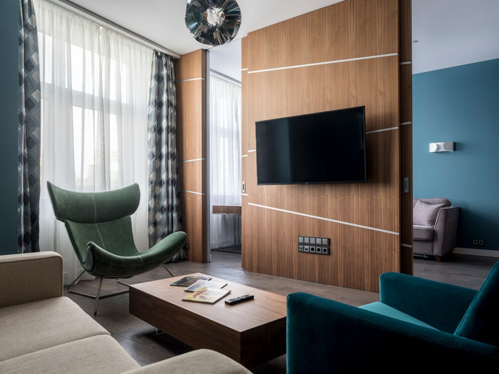 I admire the wooden separation wall here. Apart from delivering visual details, it accommodates the TV and boasts concealed sliding doors.