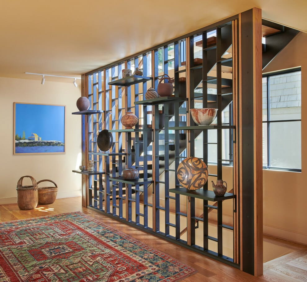 Talking about dividing wall ideas, consider room dividers that do double duty. This ceiling-to-floor screen, for example, employs open shelves for ornate ornaments.