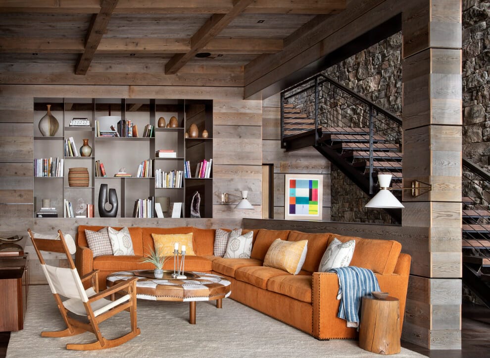 The muted orange sofa offsets sleek gray shelves. Furthermore, the rocking chair, striped throw blanket, upholstered coffee table, wall lights, and mismatched pillows become highlights.