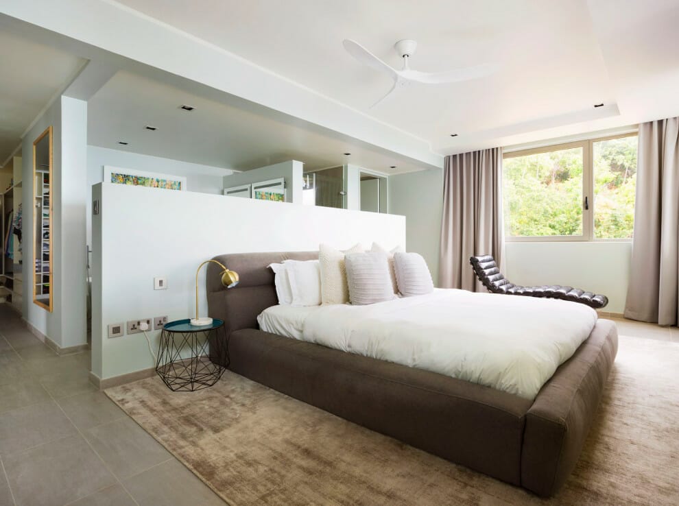 The incredibly brilliant design of the partition walls ensures the all-white home doesn’t feel flat. In addition, they introduce a sense of definition without messing with existing decor.