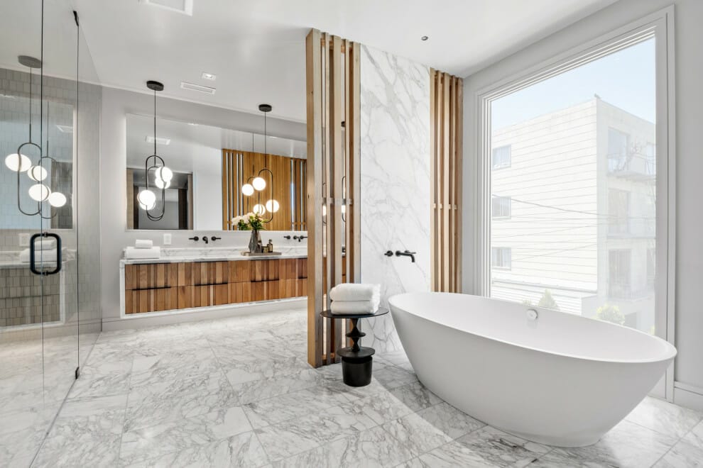 Here, the marble-and-wood dividing wall produces a balanced look and visual separation. Additionally, it brings this glam master bathroom together. Lastly, the modern rustic wooden vanity ensures the space doesn’t feel stark.
