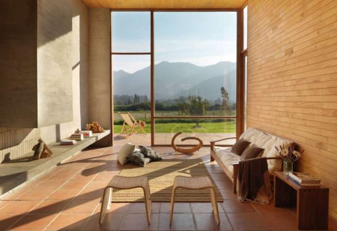 If your living room is not so large, glance at this idea. Here, the wood-framed wall windows offer you an unobtrusive view of the mountain and fresh air. However, you might lose your privacy.