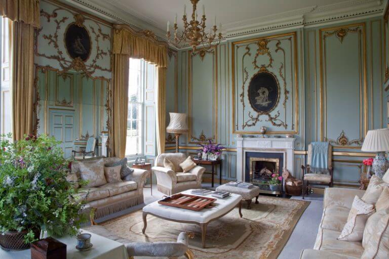 The long silk curtains, French country rug, and crystal chandelier carry luxury touches to the living room. Chairs and sofas offer ample seating area. Lastly, houseplants prevent the space from becoming lifeless.