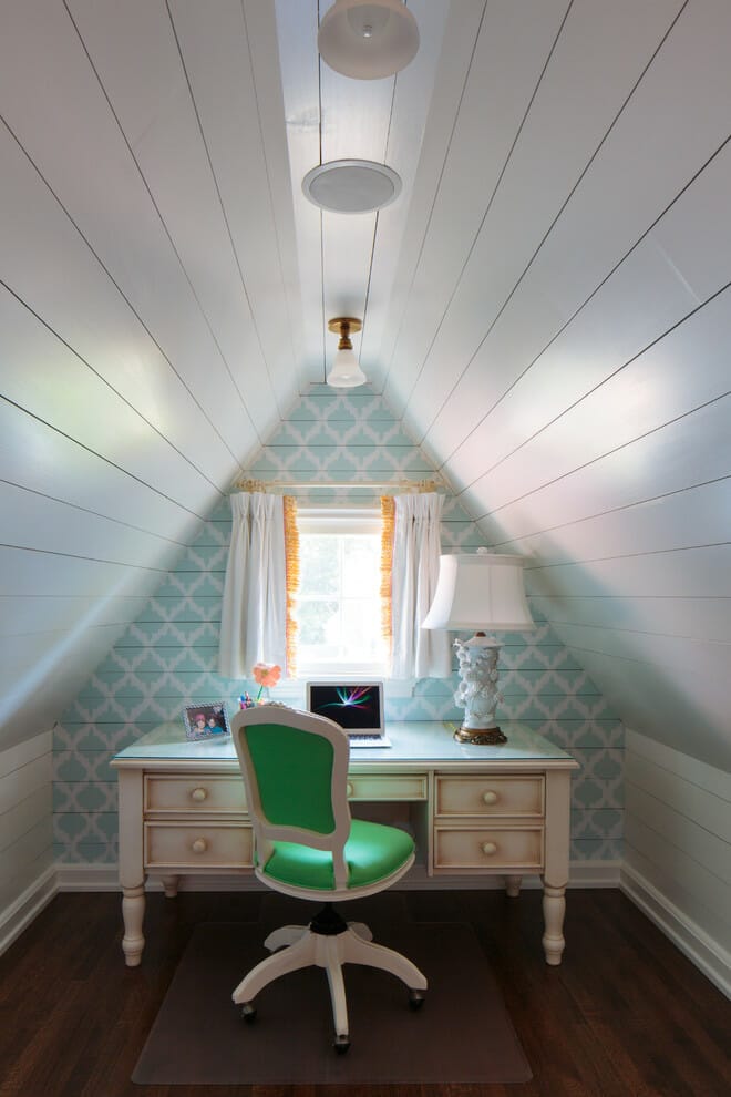 Need loft ceiling ideas? You can copy this tiny loft study room. Pure white slanted ceilings enlarge the space.