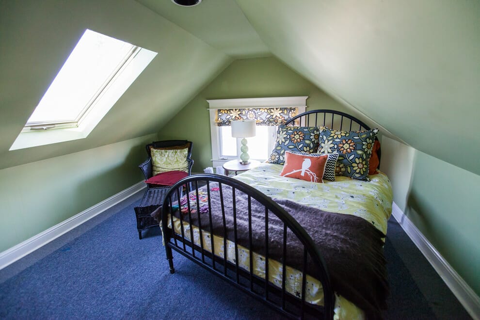 Thanks to muted green and light gray paint colors, they make the tiny attic sleeping area tranquil. Meanwhile, the skylight and small window provide natural lighting.