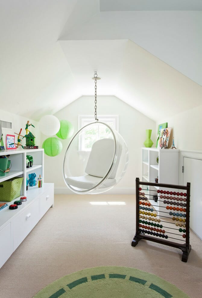 Besides, the bubble chair allows kids to take a nap, relax, or indulge in a book. Moreover, paper lantern lampshades and toys give the playroom a splendid look instantly.