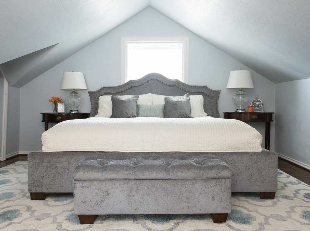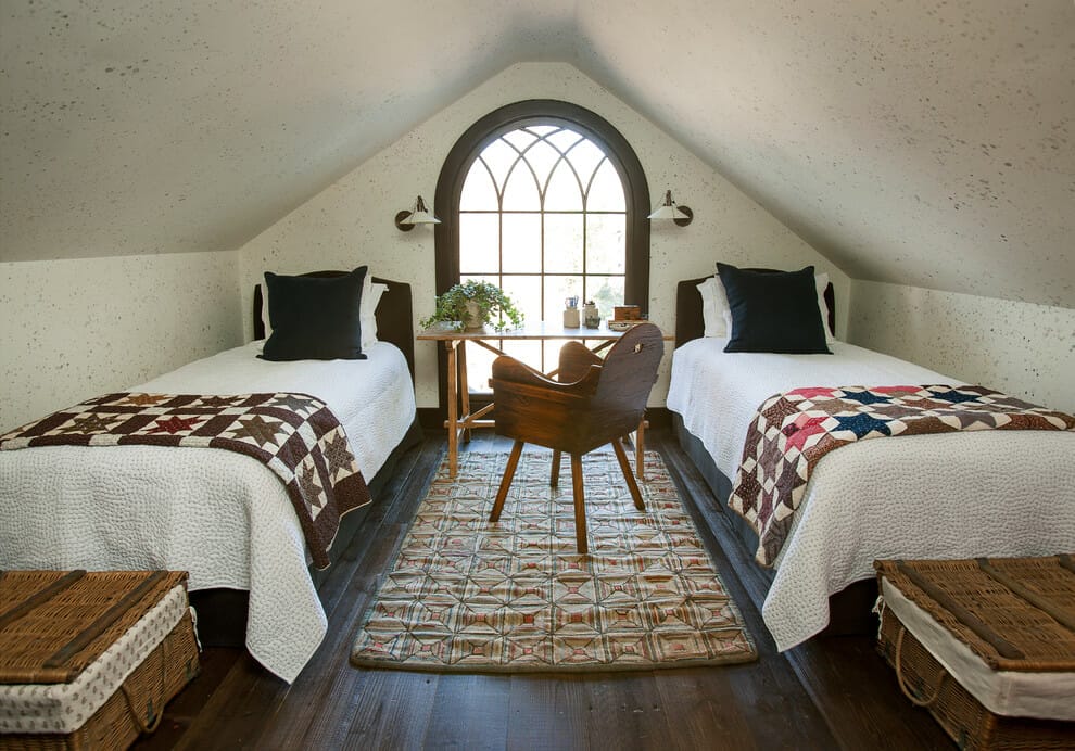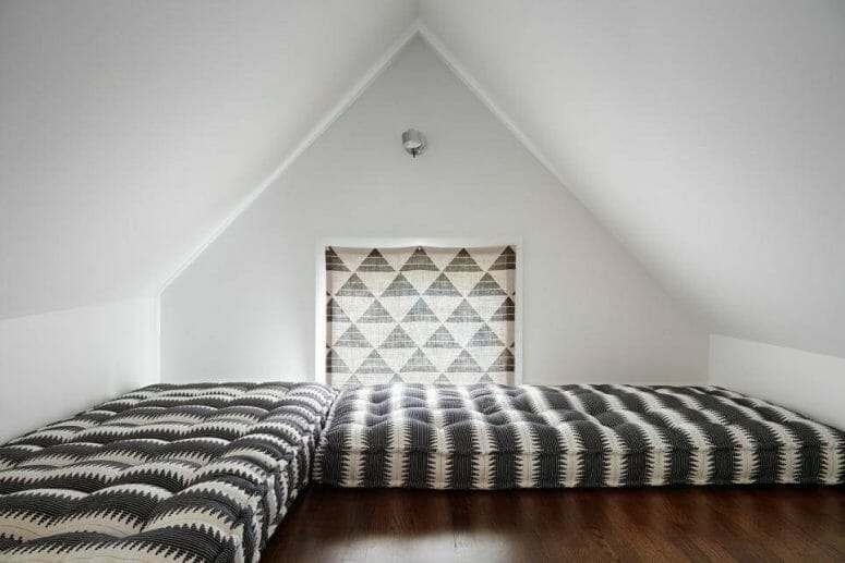 Furthermore, the gray rug and bedding stop the open-plan attic room from appearing stark.
