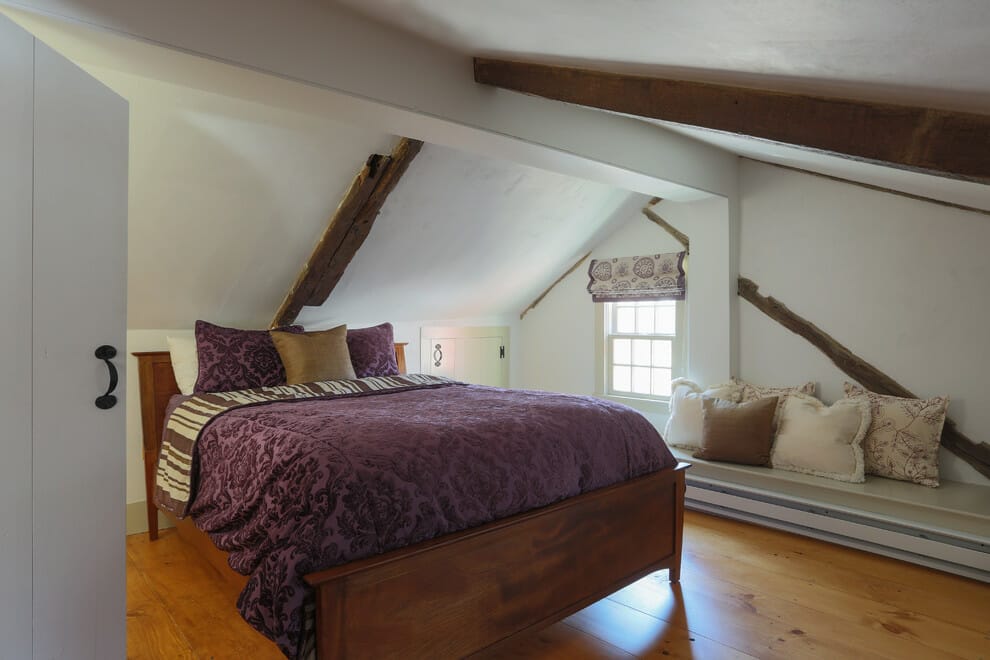 Although this attic sleeping area is confined, it still has room for storage and furniture pieces. The wooden bench conveys homeliness, whereas the sloped ceiling and walls exude intimacy.
