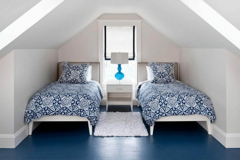 Treat your teen girls to this eye-catching attic bedroom. Moreover, it boasts dual white beds, blue-and-white patterned beddings, and gray headboards.