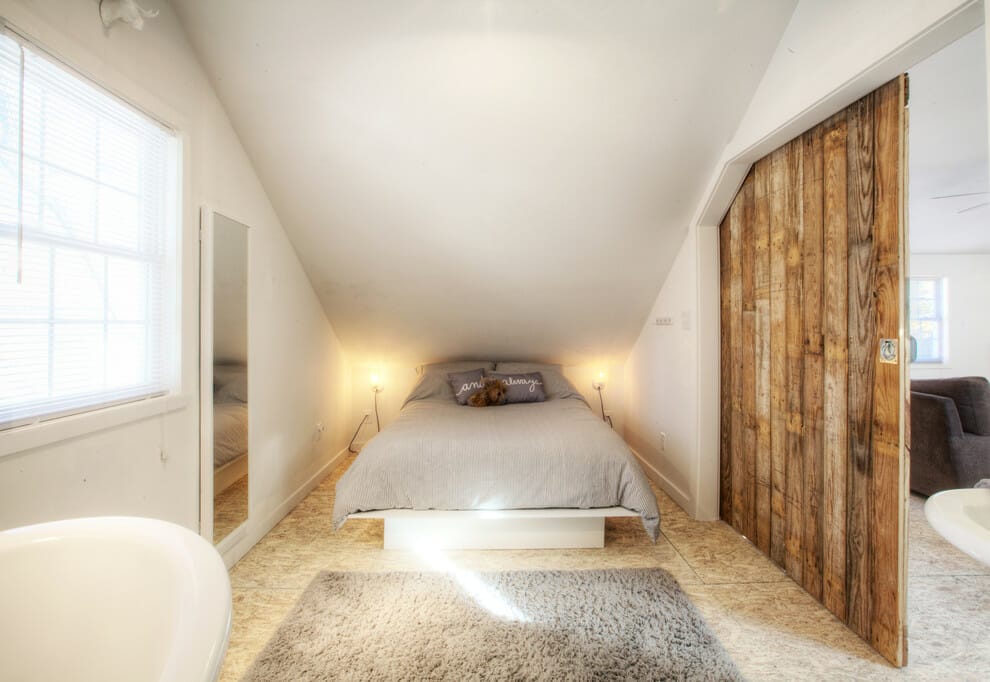 This loft bedroom is full of character. The dweller used white paint on the molding, window frame, sloped ceiling, and walls.