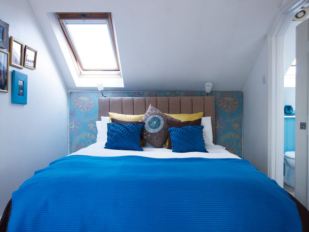 The gray tufted headboard guides the eye to marvelous pillows. Furthermore, the floral feature wall, photos, and bold blue accents spice up the attic.