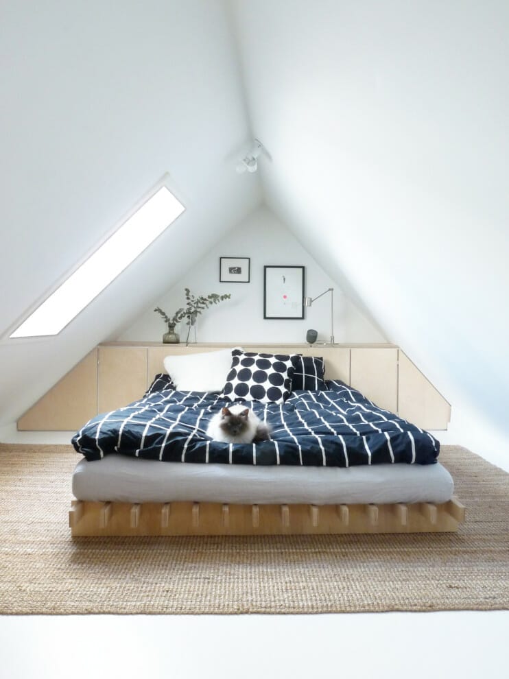 If you admire low ceiling small attic room ideas with open layouts, copy this space. The white platform bed, mirror frame, molding, and walls epitomize spaciousness.