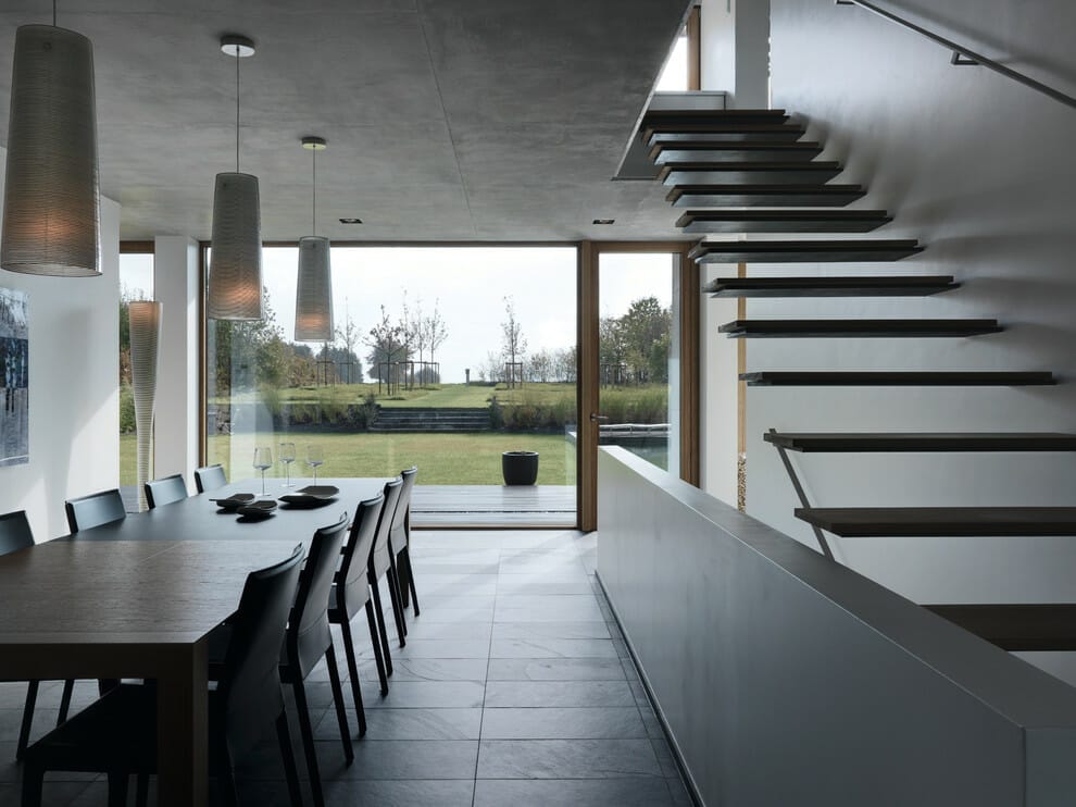 The simple half wall generates separation here. As you see, it stylishly distinguishes the floating staircase from the formal dining room.