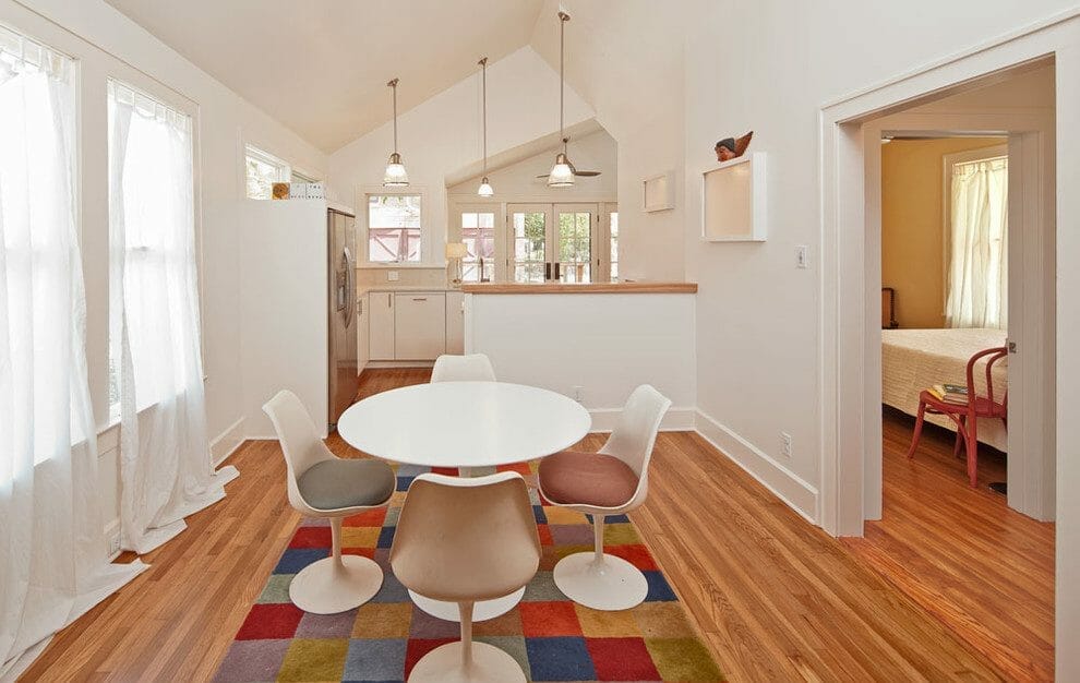 Meanwhile, the colorful rug and pastel-colored chair cushions keep the casual dining area from looking lusterless.