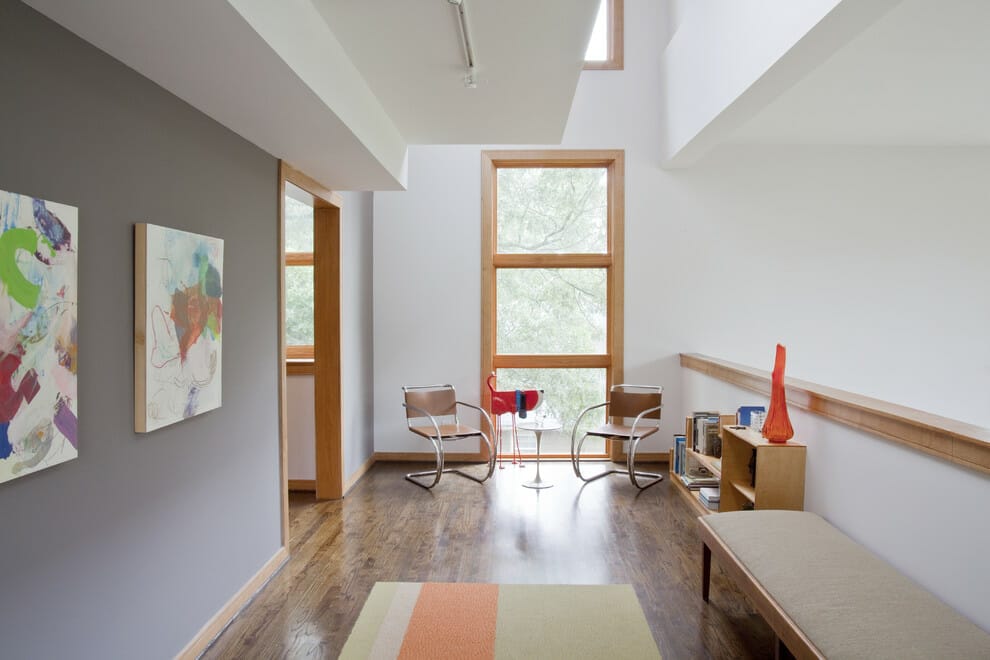Since the trendy pony wall generates definition, the art gallery feels inviting. Also, it highlights the wooden bookcase and upholstered bench.