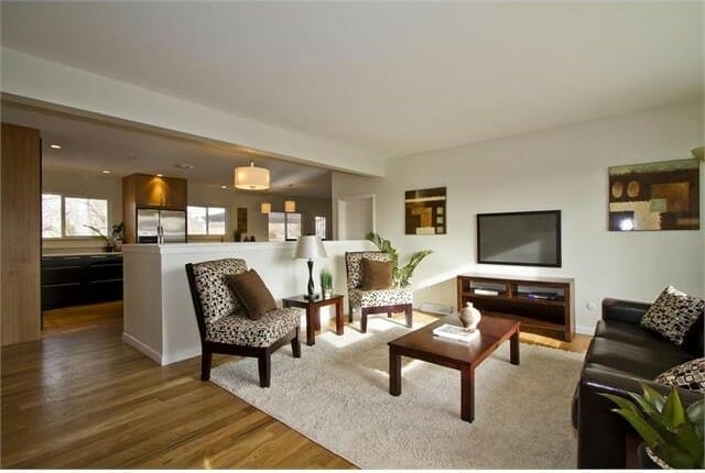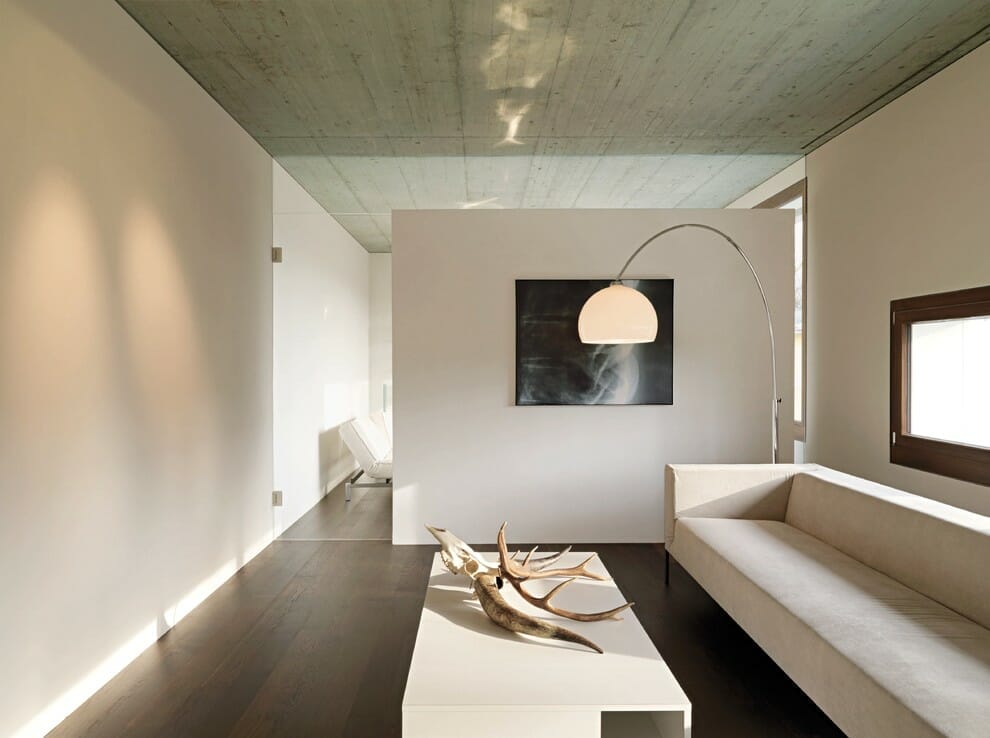 This is one of the pony wall ideas for minimalist and modern spaces. Then, the simple white partial wall serves as a barrier between two living spaces.