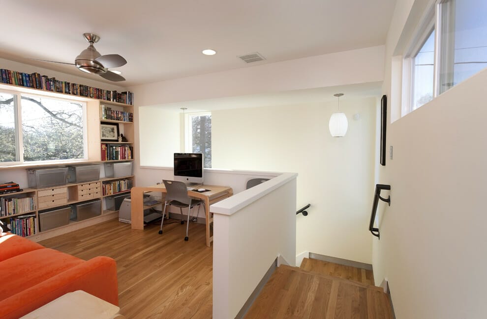 Besides, the silver ceiling fan ensures the homeowner enjoys working from home. In addition, the bright orange sofa counteracts the plain white half wall.
