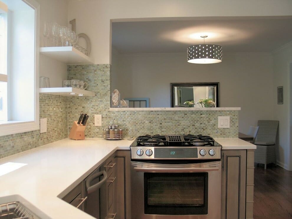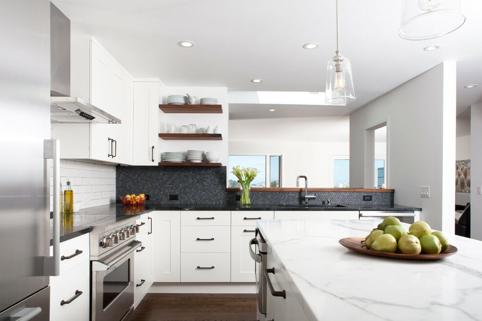 Due to the marble top and mini subway tiles, the half wall seems attractive. Although the half wall carves delineation, it still maintains easy connectivity.
