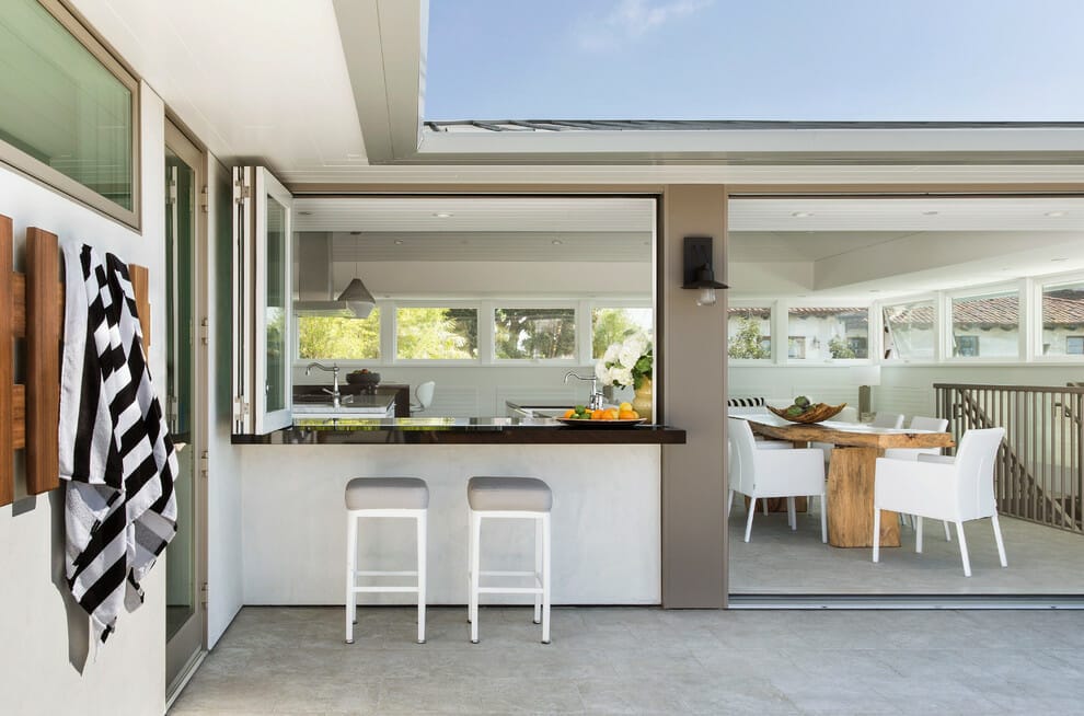 The homeowners added a couple of taupe-and-white stools under the half wall’s top. They installed folding windows right above the partial wall too.