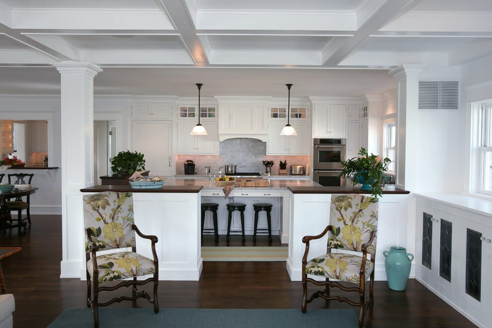 Since the partial walls terminate at kitchen columns, they introduce visual lines. Also, dark wood tops of pony walls hold the plant and coastal decorations.