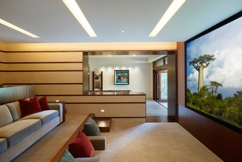 Furthermore, recessed lights of different sizes illuminate the striking partial wall and home theater evenly.