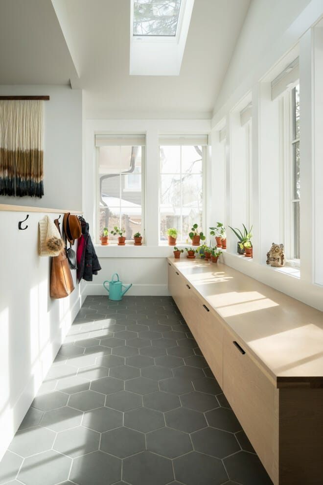 Here, the homeowner installed the light wood top to complete the white half wall. As you see, it matches the nearby storage bench featuring potted houseplants.