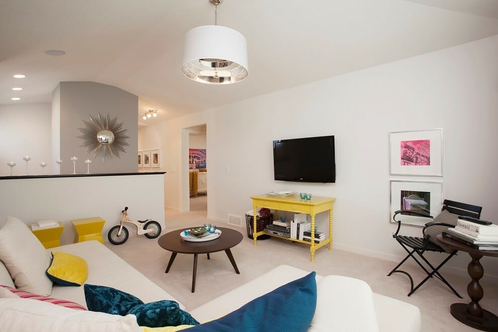 Not only does the partial wall define individual spaces, but also emphasizes the yellow stools. Blue, yellow, and pink accents freshen the otherwise drab family room.