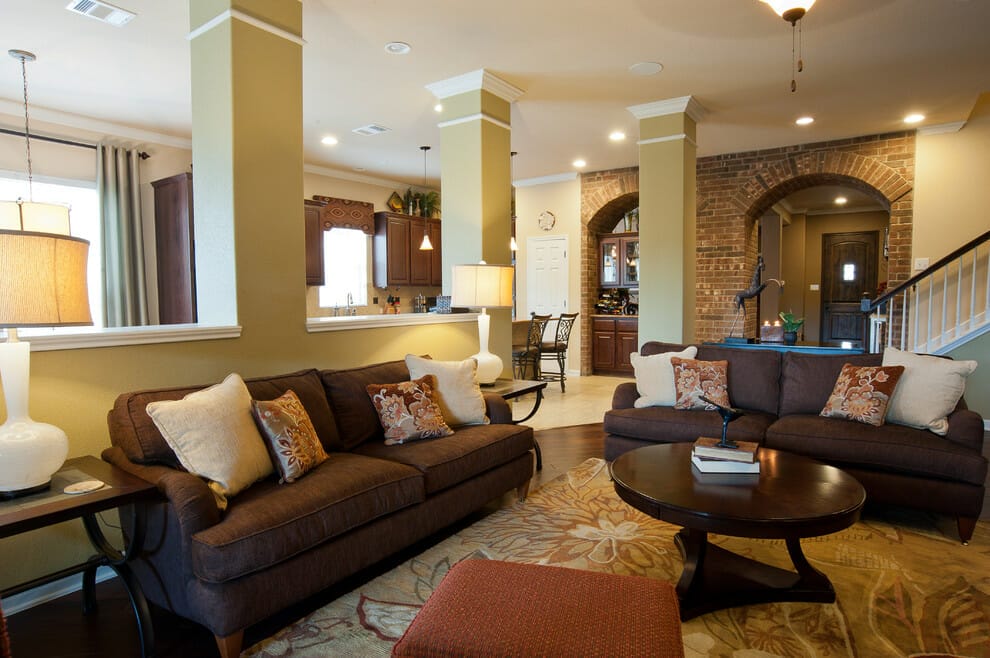 In this photo, the khaki-colored half wall creates visual separation. Furthermore, the homeowners set the dark brown sofa against it.
