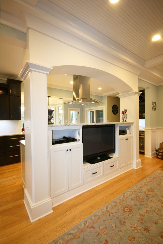 Aside from the shelving, the custom half-wall has a granite top, columns, drawers, and cabinets. The arch over the granite top softens the partial wall’s sharp angles.