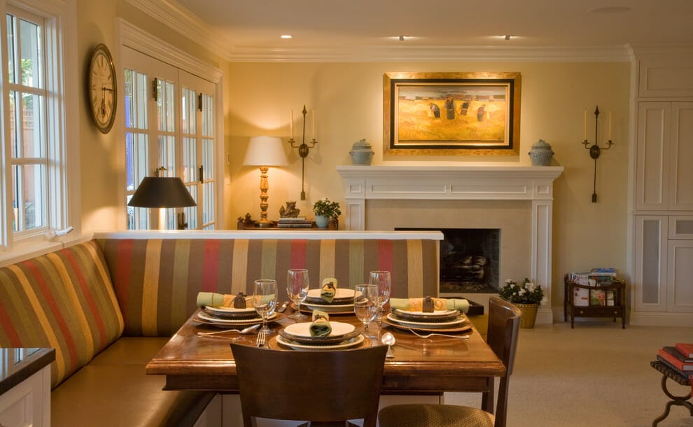 This partial wall gives the transitional room banquette seating. It distinguishes the dining nook from the sitting area with a fireplace.
