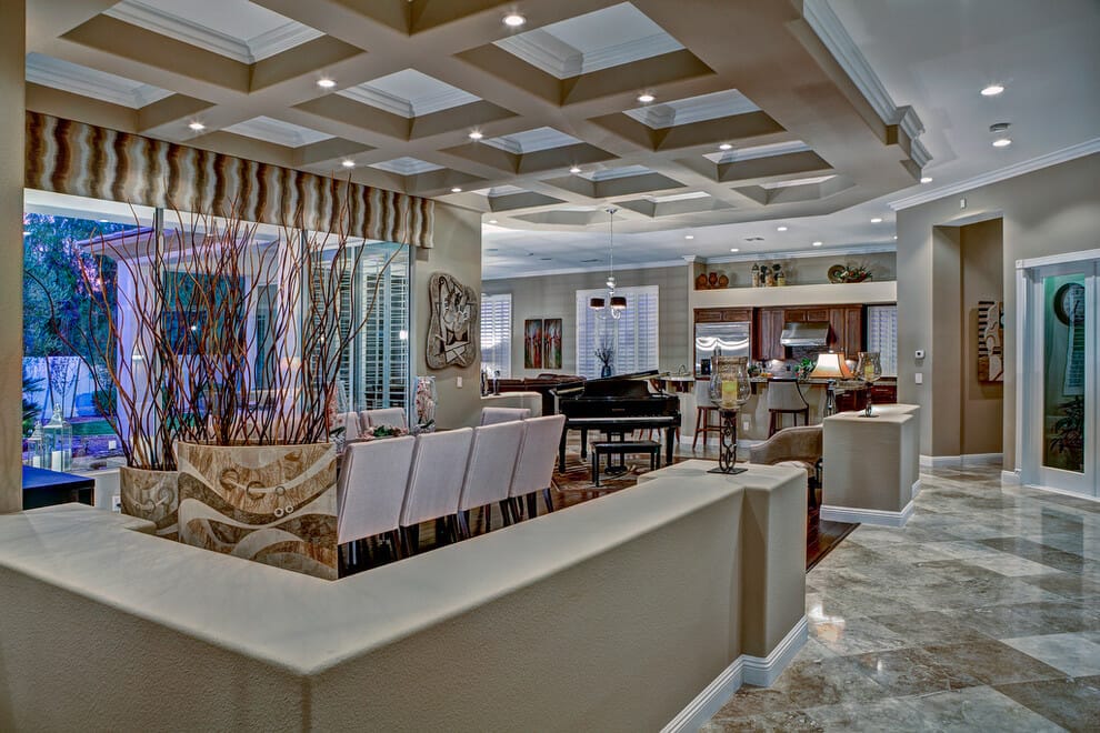 Taupe-and-white half walls define the music area and dining room. It holds the classic candleholders while complementing the coffered ceiling too.