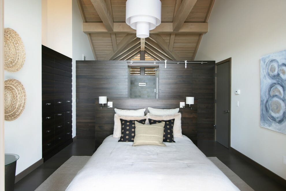 The dark-colored wood pony wall and headboard embody seamlessness. Here, the partial wall accentuates white sconces and multiple pillows.
