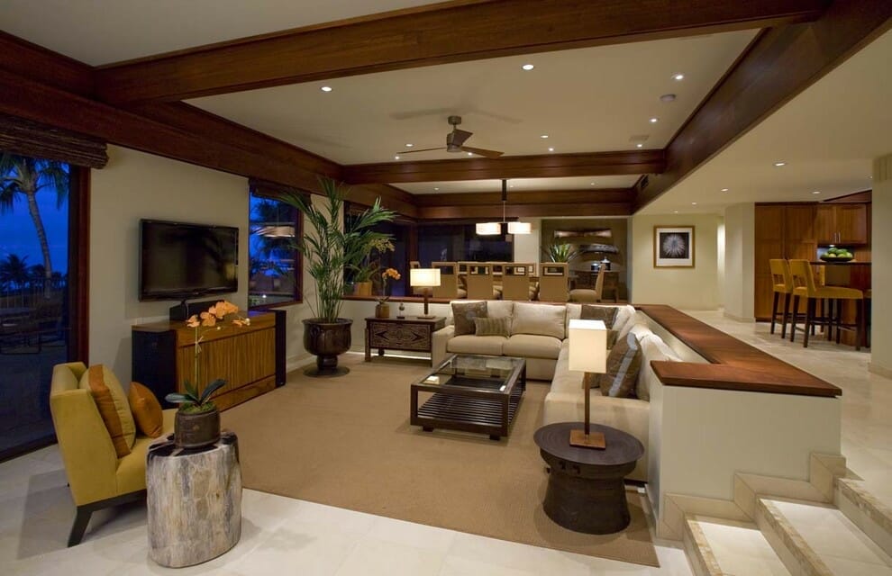 The wood-top half wall hugs the beige sectional sofa’s back. It also demarcates the sunken sitting area from the culinary space in style.