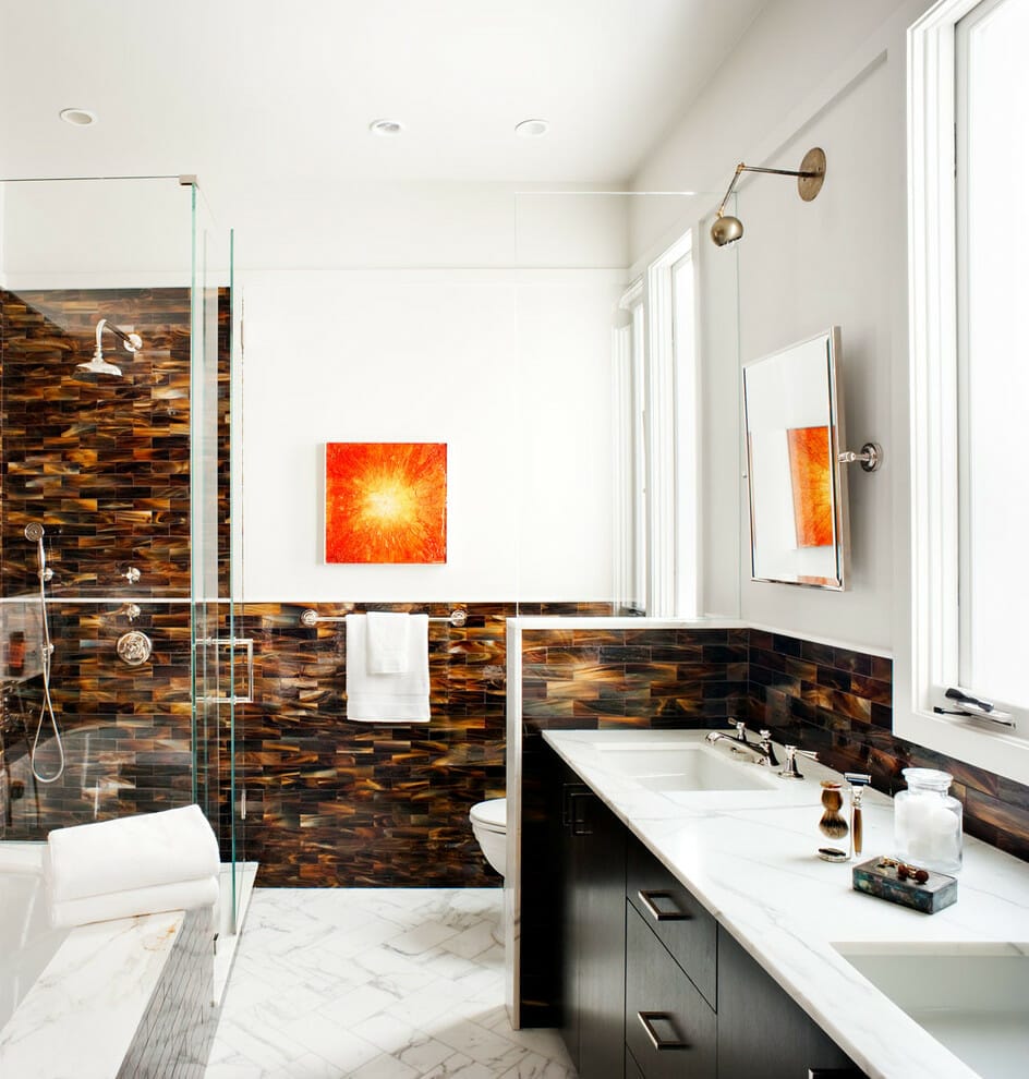 Many homeowners are into modern half wall ideas for bathrooms. The pony wall separates the marble-top black vanity from the toilet without fully closing them off.