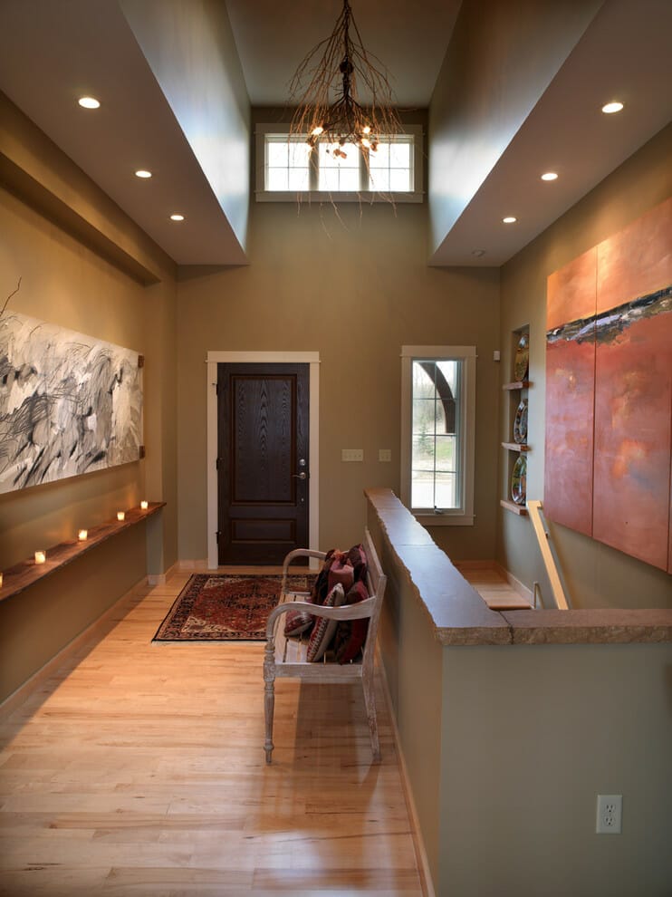 Some people are not familiar with modern half wall ideas for hallways. The warm gray partial wall makes the hallway cozy.