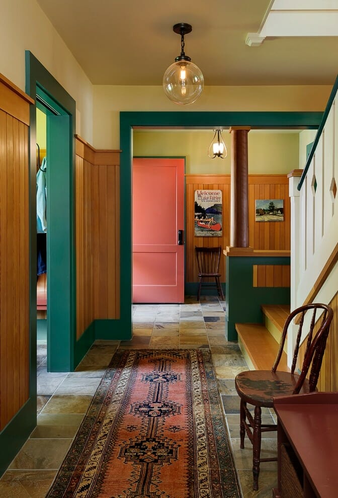This forest green-and-wood partial wall ties the entryway together. The dark-toned wood pillar lends it a feeling of grandeur.
