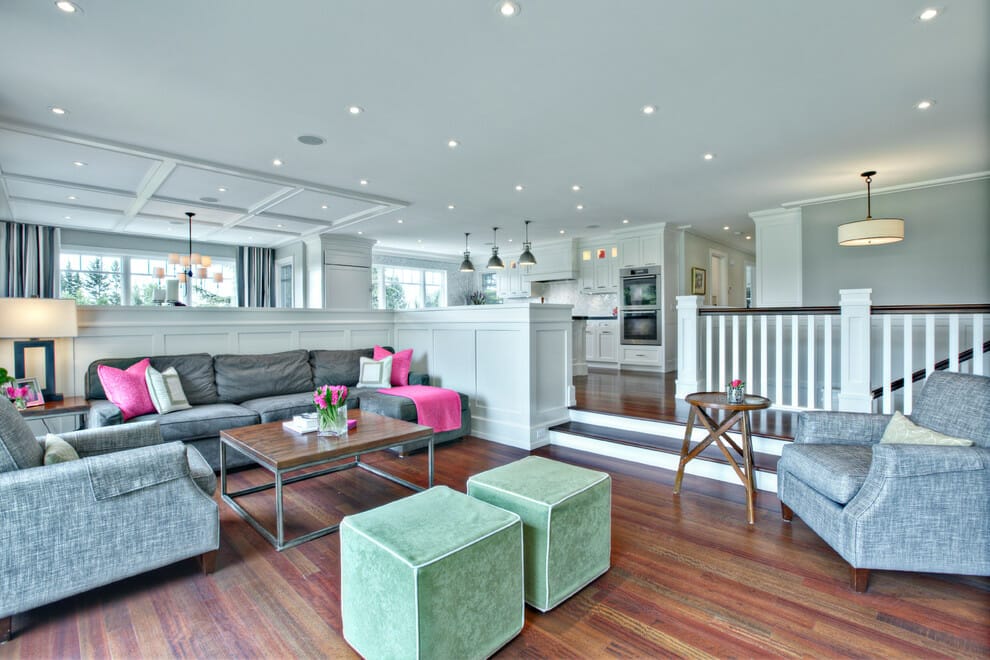 Aside from creating definition, the pony wall carries architectural interest. Furthermore, it increases the large open area’s wow factor.