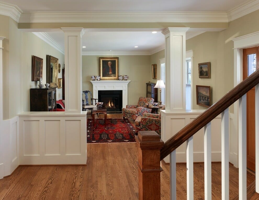The wooden cap of the half wall complements the wood flooring. Additionally, it makes the partial wall a graceful interior finish.