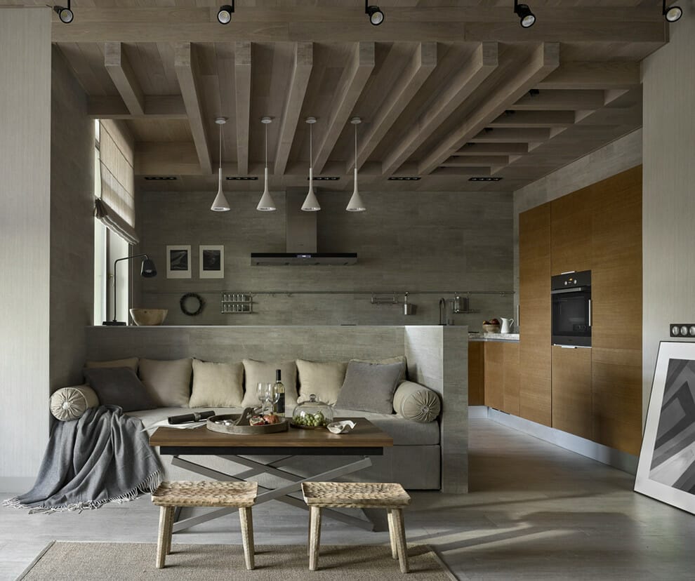 An L-shaped wooden bench with patterned sofa cushions works well against the neutral white wall. Besides, the concrete slab tabletop matches the grayish hue of the seating area.