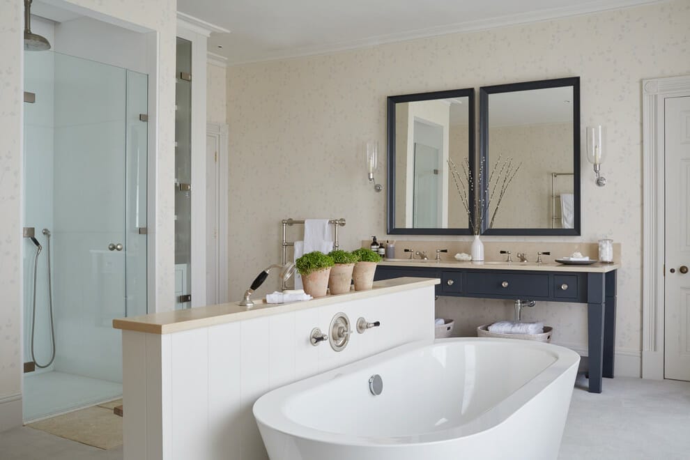 This shower and bathtub area is built with pony walls with clear glass inserted into them. Its plaster finish looks stunning against the earthy tiled accent wall.