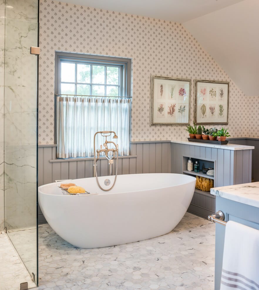 This gorgeous shiplap pony wall comes with a marble top that houses a series of potted houseplants. Besides, its neutral grey paint matches the sink area and suits the patterned wallpaper.